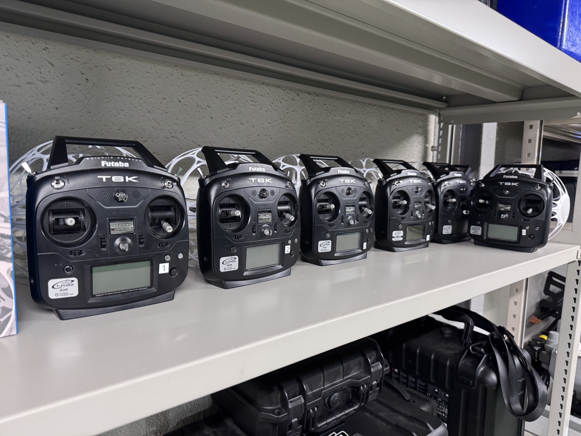 本日世界大会に出場する日本代表メンバーの練習後、練習道具置き場を見ると、整然と並んだ機体と送信機。